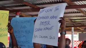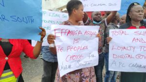 Our correspondent witnessed the crowd chanting repeatedly their wish for Effanga Effanga ‘Lasisi’ Asuquo as chapter chair: ‘Who do we want oooo?! Lasisi! For chapter chairman? Lasisi! (in refrain) with variously worded placards reading: ‘The youth of Calabar South youth want Effanga Effanga Asuquo as APC Calabar South Chapter Chair’, ‘Effanga Asuquo is the people’s choice for APC Calabar South’, ‘Stop using the Governor’s name for your selfish interest… APC Calabar South’.