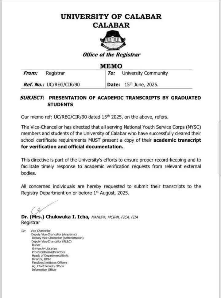 Calabar —A controversial memo allegedly issued by the Registrar of the University of Calabar (UNICAL), directing all graduating students to obtain and resubmit their academic transcripts for verification, has sparked outrage among students, alumni, and the general public. The memo, dated June 15, 2025, went viral on social media on Tuesday and provoked a wave of condemnation over what many described as “extortionist” and “illogical.”