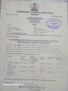 CALABAR –A leaked memorandum from the office of the immediate past Head of Service has shed new light on the recent controversial appointment of Orok Bassey Okon Esq., revealing that the Governor’s choice was made from a shortlist of three pre-vetted Permanent Secretaries where the appointee held a claim to being the most senior NEGROIDHAVEN can report authoritatively.
