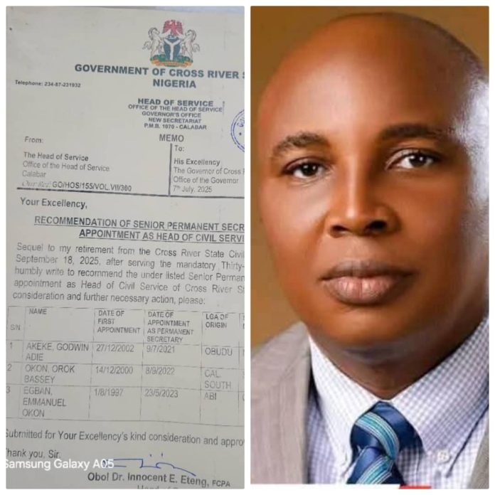 The memo, dated July 7, 2025, and signed by the outgoing Head of Service, Dr. Innocent E. Eteng, was addressed to Governor Bassey Otu and titled “Recommendation of Senior Permanent Secretaries for Appointment as Head of Civil Service.” It was written in anticipation of Dr. Eteng’s retirement on September 18, 2025.