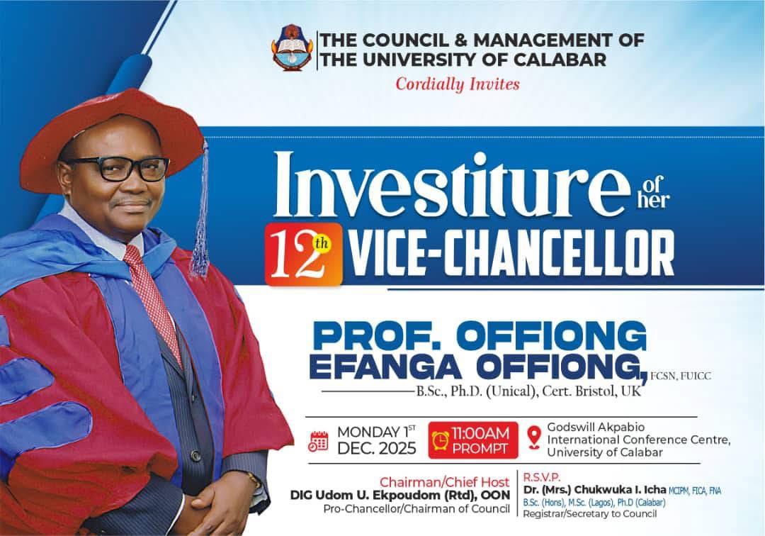 The investiture will formally usher in the tenure of Prof. Offiong as the 12th Vice-Chancellor, marking a new phase in UNICAL’s academic leadership and governance.