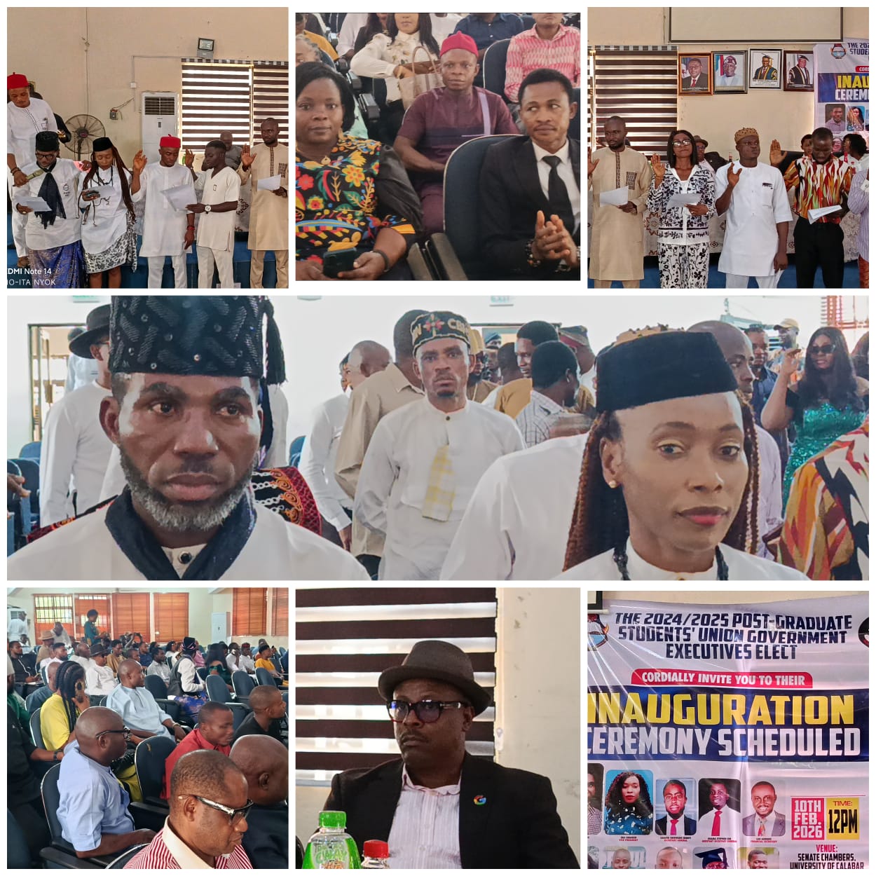 The inauguration, witnessed by university officials, local government representatives, religious leaders, and postgraduate students, marked the restoration of elected leadership in the University of Calabar Postgraduate Students’ Government after a period of administrative uncertainty.